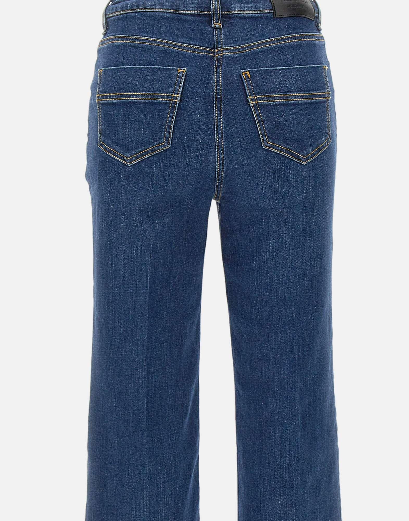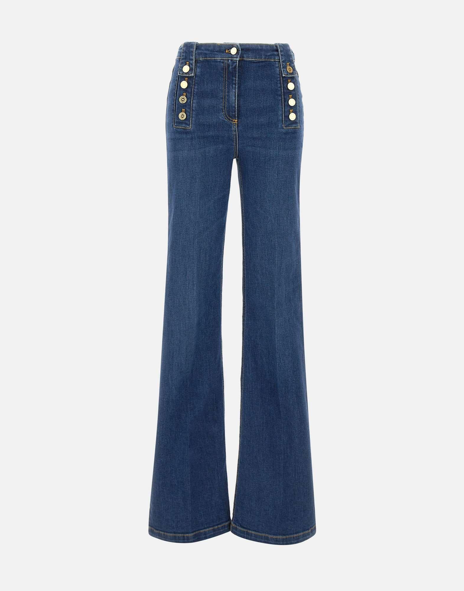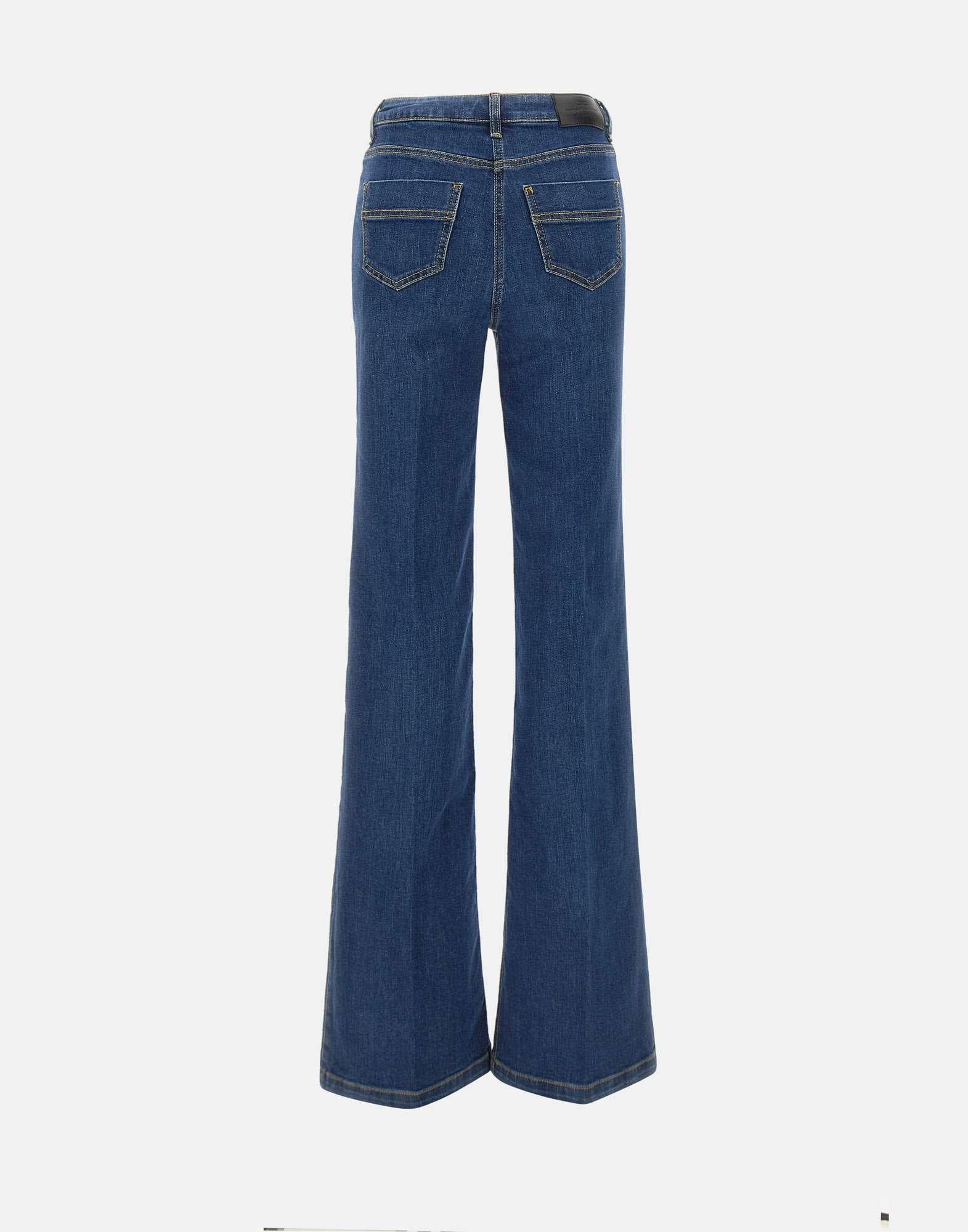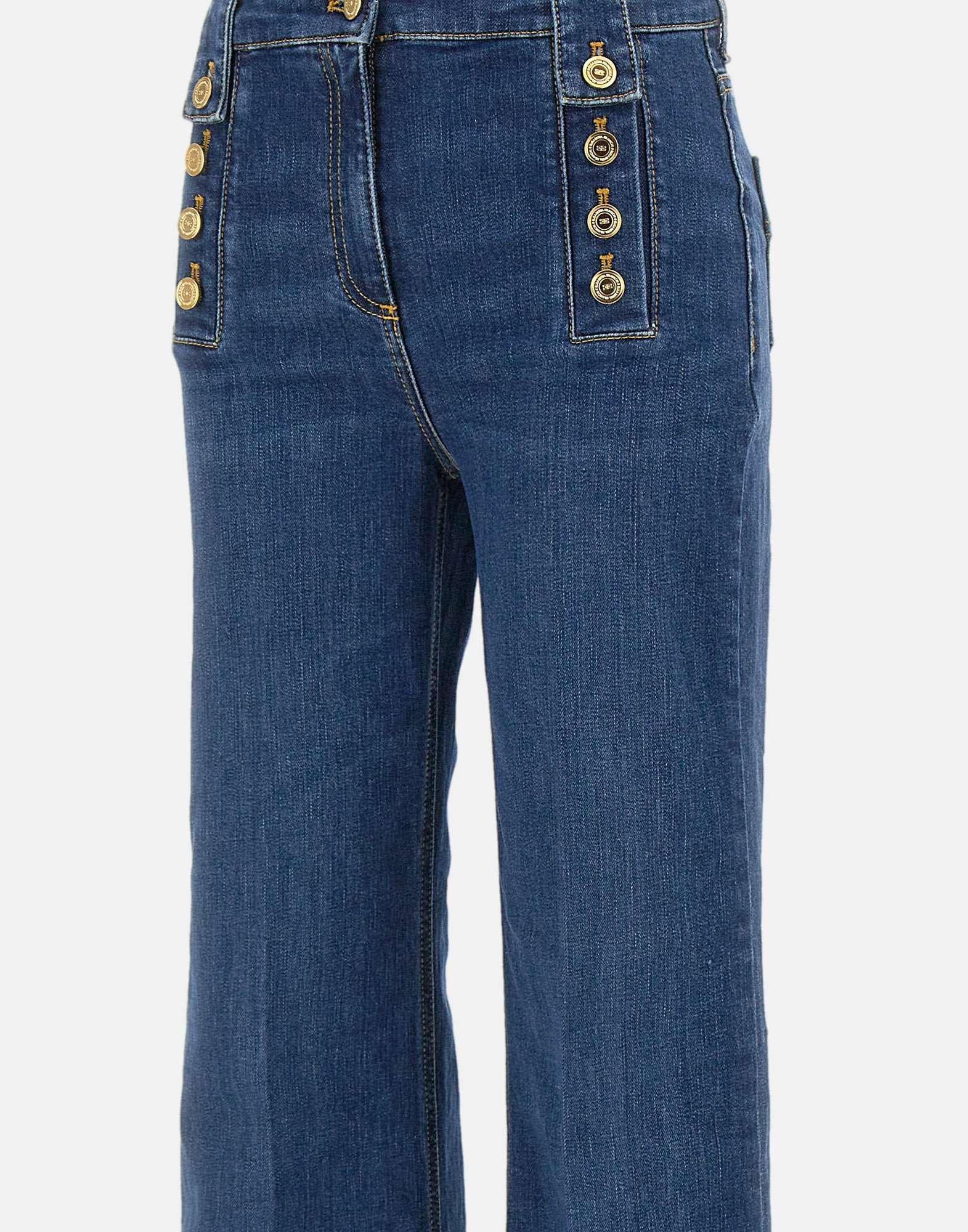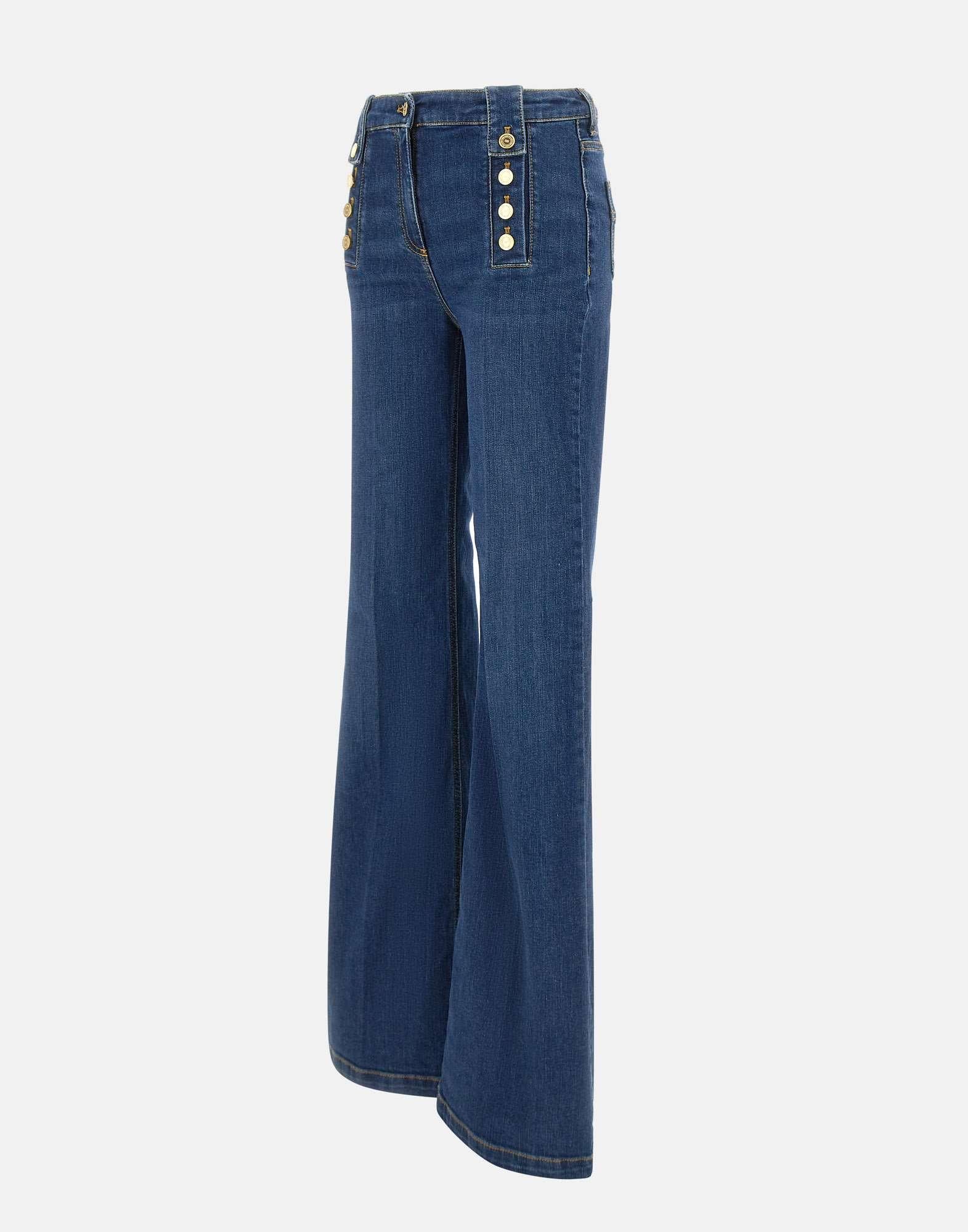 Elisabetta Franchi "Urban" jeans in dark-wash blue denim, crafted from a cotton and lyocell blend. Palazzo style with side belt loops embellished with gold-tone logo buttons. Patch pockets at the front, logo label at the back, and 25 cm hem. Length 92 cm (IT 40). Regular fit.