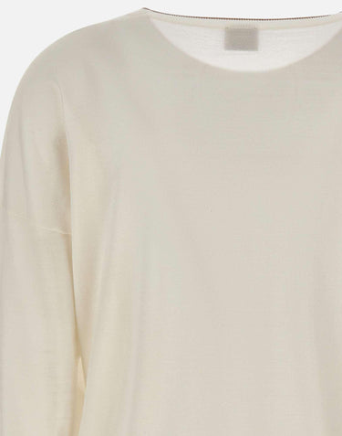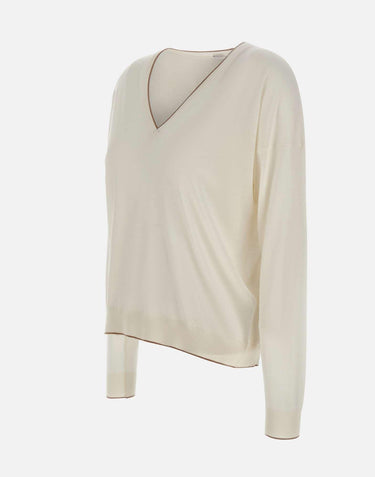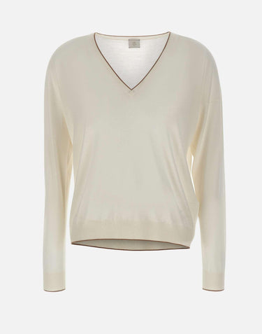Eleventy women's wool sweater, white, long sleeves, V-neck, ribbed edges with contrasting color stripe, regular fit, made in Italy