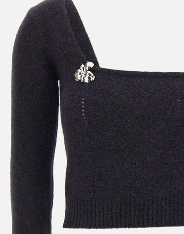 Blumarine sweater, black, wool and alpaca blend, one shoulder, ribbed edges, silver flower detail, regular fit, made in Italy