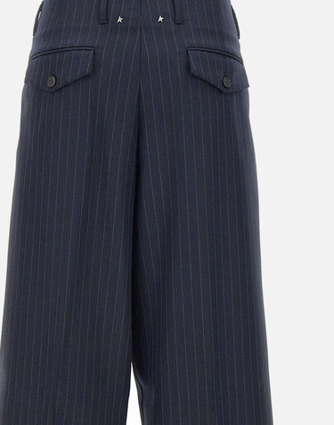 Womens Golden Goose "Flavia" trousers, crafted fine wool gabardine with navy blue pinstripe pattern. Part of Golden Collection, they feature a mid-rise waist with belt loops, zip, hook and button closure. The tailored design includes side welt pockets, back flap pockets with button, double pleats, and signature double star logo. Wide leg with 28 cm hem and regular fit deliver a contemporary elegance. Made in Italy