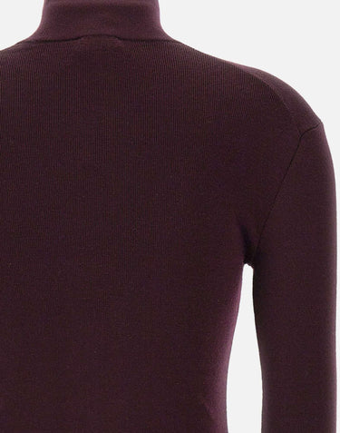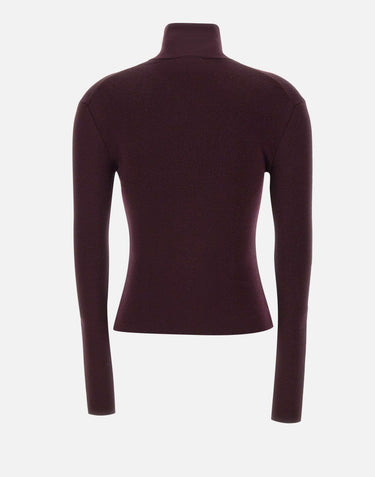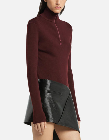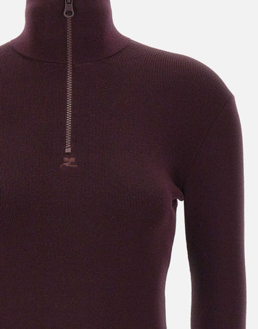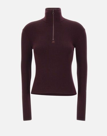 Women's Courrèges "Zipped Mockneck" pullover in pure wool, in an elegant chocolate tone. Featuring a half-zip front, high stand-up collar, and tonal AC logo embroidery on the chest. Long sleeves and a slim fit silhouette provide warmth and a refined, minimalist aesthetic ideal for transitional and winter layering.