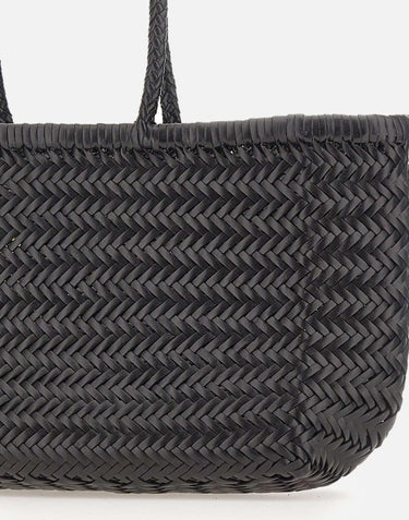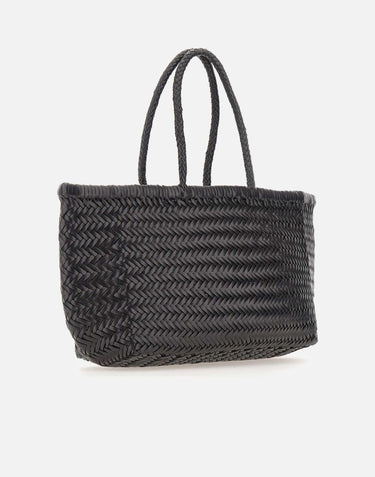 Dragon Diffusion "Bamboo Triple Jump Big" handbag in black buffalo calfskin, hand-woven with an iconic diagonal chevron weave. This unlined bag features a roomy silhouette and a double top handle. The antiqued Saint Christopher pendant, a symbol of protection for travelers, is hand-sewn inside. Includes a fabric dust bag. Dimensions: top width 45 cm, bottom width 33 cm, height 24 cm, handles 17 cm.