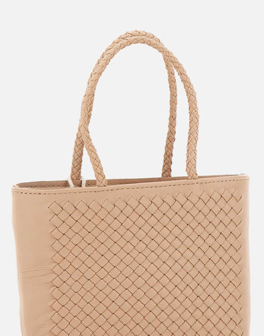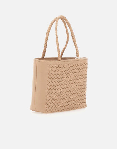 Dragon Diffusion "Gia" leather handbag, antique pink, entirely hand woven, double top handle, removable shoulder strap approximately 100cm, lined, medallion of St Christopher protector of travelers inside, shiny silver finishing, measurements: length 14cm at base, height 11cm, depth 5cm.