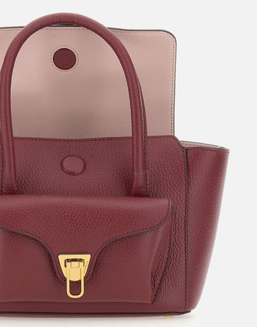 Coccinelle "T8 Double Beat" handbag, crafted in pebbled leather in a refined wine hue. Elegant yet functional, it features double top handles, flap with magnetic button closure, and a gold-tone front logo. Additional details include an external snap pocket, internal pouch pocket, protective metal feet, and gold-tone hardware. An adjustable and removable shoulder strap ensures versatile wear. Dimensions: 21 x 11 x 15 cm. Supplied with original fabric dust bag.