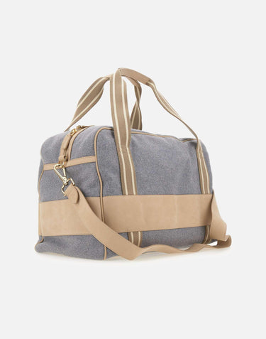 Eleventy fabric travel bag, grey with sand nubuck details, double top ribbon handle, external zip pocket, gold plating, top zip closure, removable shoulder strap approx. 80cm, logo embossed on outside, feet on bottom, internal pockets, case included,