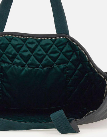 Carharttt Wip "Alumni Tote Bag", smoke grey color, durable nylon, contrasting green diamond quilted interior, double top handles, zipper closure, silver electroplating, front and back logos, exterior pouch pocket, interior pocket, removable ribbon shoulder strap, measures38x52x18