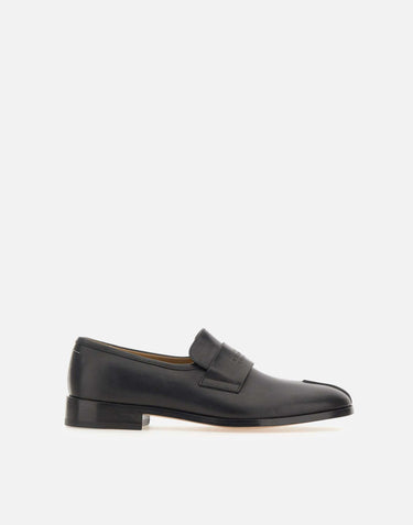 MM6 Maison Margiela loafers, crafted in black vegetable-tanned leather. The design features a front strap with embossed Signature Numeric logo, visible topstitching, and a leather sole with high heel. The Maisons iconic white stitched line on back adds a distinctive touch. Regular fit. Made in Italy.
