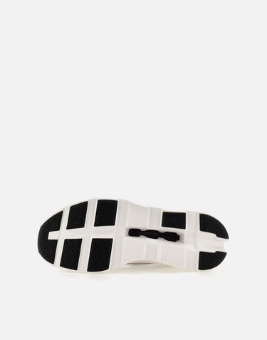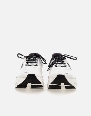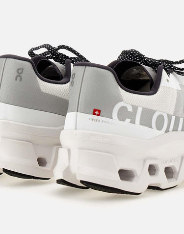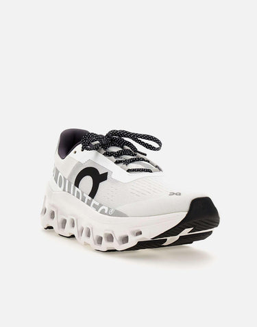 On "Cloudmonster" men's recycled fabric sneakers, breathable, white with grey and black details, super light with a weight of only 280g, CloudTec® technologies for an extraordinary sensation of bounce and Speedboard® for great energy, pronounced arch shape to give momentum while running, Helion super foam for ultra-comfort cushioning, polka dot laces, logo on tongue, upper and back, 4.5cm high rubber sole. Fits small, a half size larger is recommended.