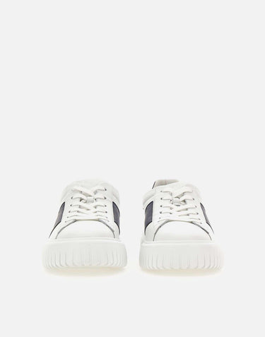 Hogan "H Stripes Allacciato Banda" men's sneakers, white with blue details, sporty and versatile, smooth nappa upper, logo side stripe, stitching on the heel, soft padding, flat laces, 8 mm memory foam insole, serrated EVA outsole, total height 4.8 cm. Fabric case included, regular fit. Includes an extra pair of laces, made in Italy. Size UK 10 corresponds to a 44 1/2. Convert your size using the HOGAN MEN'S FOOTWEAR UK size chart.