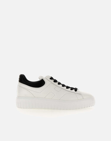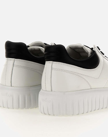 Hogan men's "H-Stripes" black and white leather sneakers, flat black laces, side H with stitching, memory foam fussbett, gold logo on padded tongue, leather lining, extralight rubber platform sole with 4cm high vertical stripes with logo. Care and maintenance instructions included. Fabric case and additional laces included. Made in Italy. loose fit we suggest buying half a size smaller than your usual size