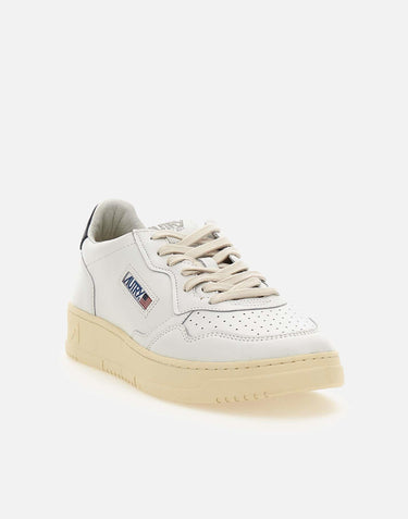 Autry "LL12" men's leather sneakers, total white with navy blue heel detail, design that recalls vintage 80s models, perforated toe, flat cotton laces, tongue with silver logo, fabric insert with logo embroidered on outside, padded collar and heel, logo on back, cotton terry lining, logoed leather insole, stitched vintage effect rubber sole height 3.5 cm.