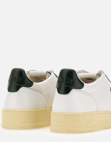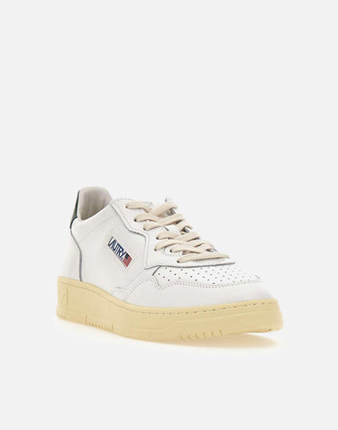 Mens Autry Medalist Low sneakers in white leather with a dark green heel tab and debossed logo, offering a subtle yet distinctive contrast. Inspired by classic 80s tennis shoes, the design features a perforated toe for breathability, flat tonal laces, and a honey-colored rubber sole for a warm, retro touch. Finished with the brands iconic side logo, this sneaker combines timeless style and everyday versatility. Regular fit.