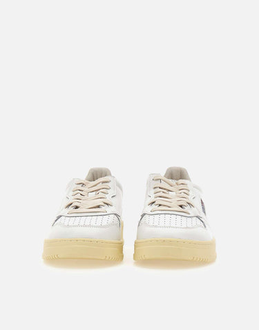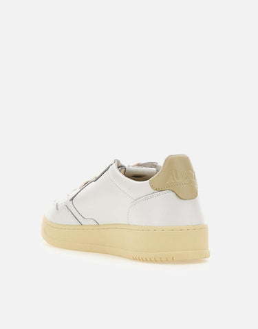 Mens Autry "Medalist Low" sneakers in total white leather with a sand-colored heel tab, inspired by classic 1980s tennis style. The smooth leather upper features a perforated toe for enhanced breathability and the brands signature side flag. Embossed logos appear on both the tongue and heel, adding refined branding details. Flat laces, an inner lining in cotton and terry fabric, and a 4 cm branded rubber sole ensure comfort and durability. Regular fit. Protective dust bag included.