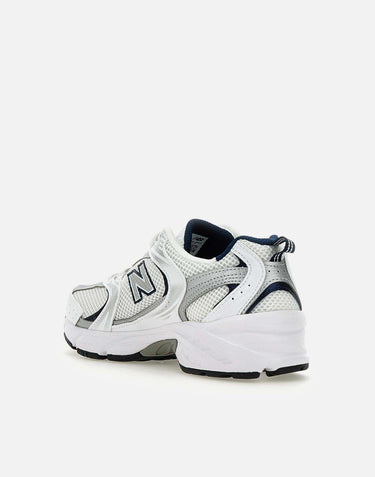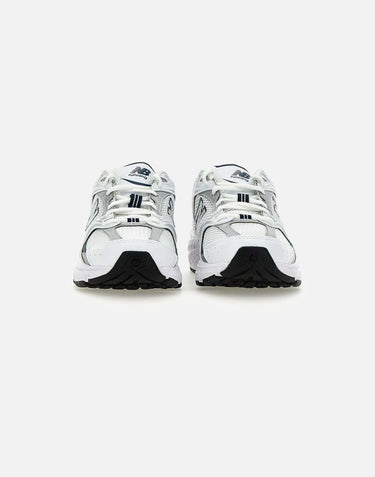 New Balance "MR530" sneakers, white with contrasting midnight blue and silver details, breathable mesh upper, matching laces, iconic side logo, white and grey grosgrain puller on the back, logo on the tongue, inspired by the jogging style with a 90s design, 3cm high ABZORB sole. Small fit, we recommend half a size up. The US size 5.5 corresponds to the EU size 38.
