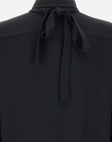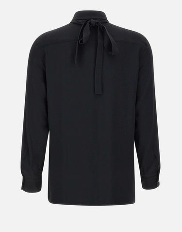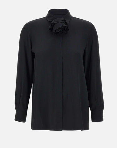 Marella "Cabiria" shirt, black, long sleeves, silk-blend crepe de chine, flowing fit, classic collar, concealed button placket, floral ribbon collar, buttoned cuffs, regular fit