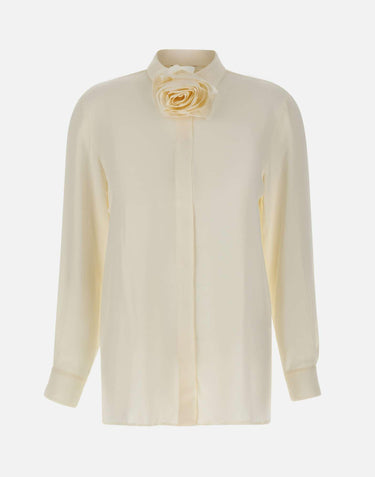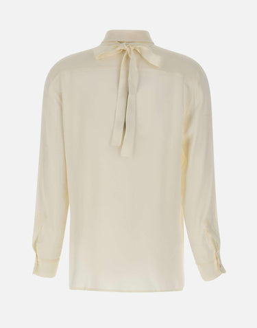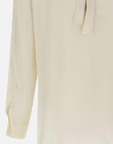 Marella "Cabiria" shirt, white, long sleeves, silk-blend crepe de chine, flowing fit, classic collar, concealed button placket, floral ribbon collar, buttoned cuffs, regular fit