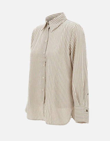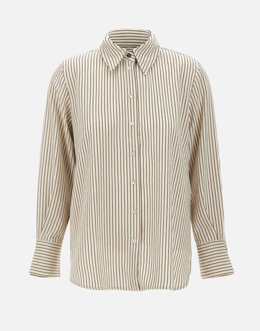 Marella "Reperto" shirt, sage and white striped pattern, long sleeves,washed viscose blend twill, classic collar, visible buttoning, long sleeves with dual-use buttons, rounded hem with side slits, regular fit