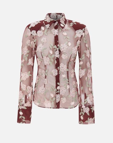 "Mesh fitted shirt" Rotate Birger Christensen, burgundy, with multicolor floral motif relief embroidery tulle, with transparencies, long sleeves, classic collar, fastening with mother-of-pearl buttons same color as logo, cuffs with buttons, removable padded shoulders, regular fit
