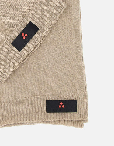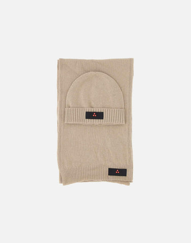 Peuterey "Silli05" set consisting of a sand beige cashmere blend scarf and hat. Both pieces feature ribbed edges and a subtle logo, one size fits all. A perfect set for a gift or for yourself