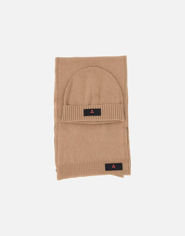 Peuterey "Silli05" set consisting of a camel cashmere blend scarf and hat. Both pieces feature ribbed edges and a subtle logo, one size fits all. A perfect set for a gift or for yourself