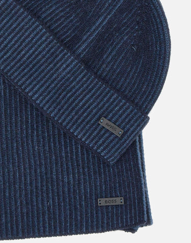The Boss "Ercole" gift set, consisting of a knitted scarf and hat, comes in blue. Crafted from warm wool and fine cashmere with viscose, it combines comfort and sophistication. Both accessories are finished with a logo plaque in coated synthetic fabric, featuring a faux leather effect with a sophisticated matte finish.