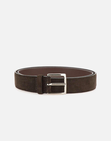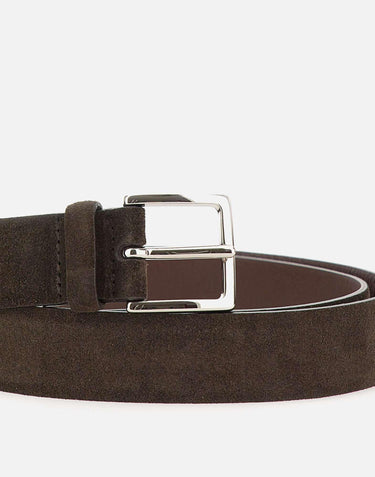 Orciani "Amalfi" men's suede belt, dark brown, textured leather back, shiny palladium logo buckle. Width 3.5cm, length 122cm. Made in Italy.