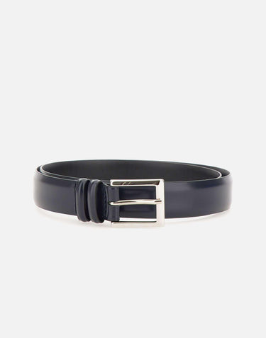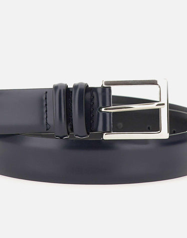 Orciani "Calf" men's leather belt, blue, shiny silver pin buckle, length 108cm, width 3cm. Made in Italy.