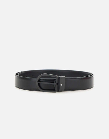 Montblanc men's leather Horseshoe Pin Buckle belt, black color, tone-on-tone buckle with logo, width 3.5 cm, one size fits all, made in Italy.