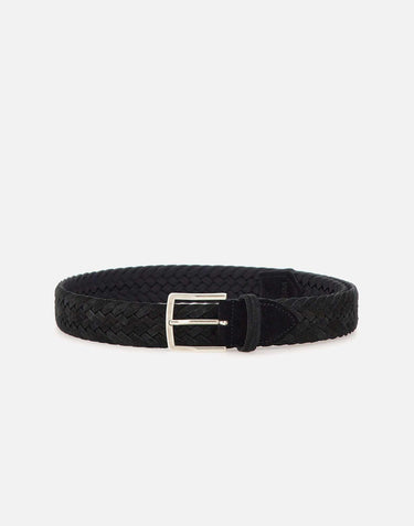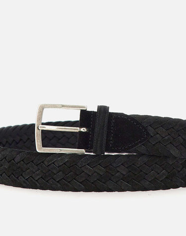 Athison men's black, suede leather belt, first woven belt world to be made entirely with threads obtained from scraps of recycled real leather and finely cut into circular section strips, without holes, silver pin buckle. Made in Italy. Width 3cm