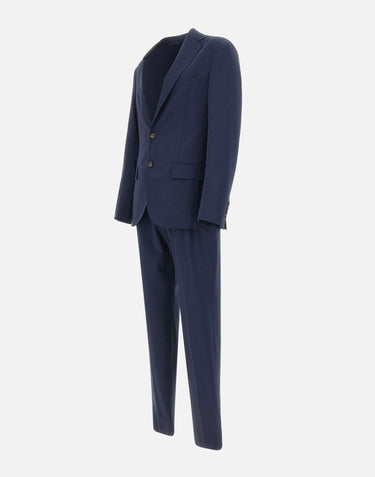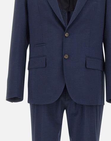 Eleventy's navy blue pure wool two-piece suit epitomizes Made in Italy sartorial elegance. The blazer features a front button closure, two welt pockets and two flap pockets on the front, internal pockets, buttoned cuffs, and a double back vent for a contemporary and functional look. The matching trousers feature a button, hook, and zip closure, two side slit pockets, and two flap pockets on the back, for a relaxed yet refined elegance. Botton 17cm. Slim fit