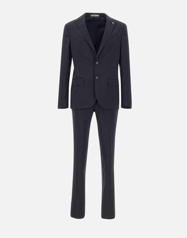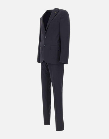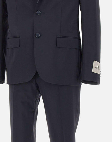 Corneliani "Right" men's two-piece suit in virgin wool, ideal for contemporary and formal elegance. The blazer features a two-button front closure, a welt chest pocket, two side flap pockets, buttoned cuffs, and a double back vent for greater freedom of movement. The matching trousers feature a hook-and-eye closure, two side slit pockets, and two back welt pockets for a clean, tailored fit.