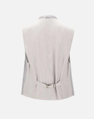 Contrasting pearl grey waistcoat, closure with five matching buttons, two front pockets, all-over logo on back.