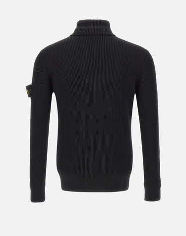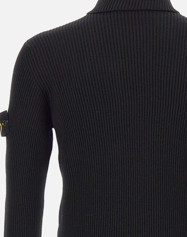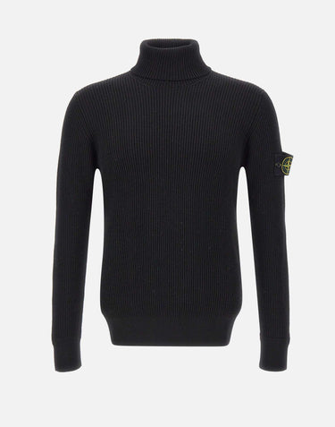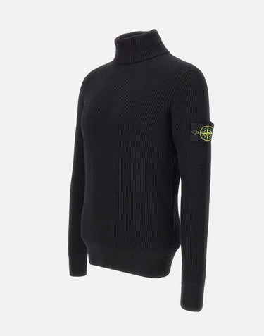 Stone Island "Full rib rws wooll sweater", black, long sleeves, 12 gauge ribbed wool, high neck, cuffs with horizontal stitching, iconic logo on left sleeve, regular fit