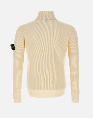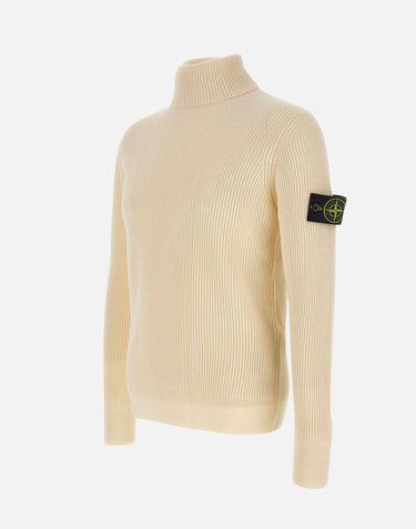 Stone Island "Full rib rws wooll sweater", cream, long sleeves, 12 gauge ribbed wool, high neck, cuffs with horizontal stitching, iconic logo on left sleeve, regular fit