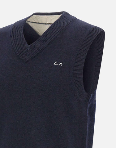 Sun68 men's vest in soft wool and cashmere, navy blue, with a V-neck and ribbed trim. The embroidered logo on the chest adds a distinctive touch to this essential piece, ideal for layering over shirts or sweaters for a refined and versatile style.