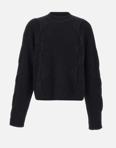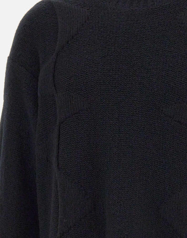 Heliot Emil men's "Cropped Spiral Knit" sweater in a wool and cashmere blend, black. Featuring an oversized silhouette with raglan shoulders, long, wide sleeves, a crew neck, and ribbed cuffs. The fluid, abstract details lend a contemporary, experimental aesthetic, perfect for urban looks and layering.