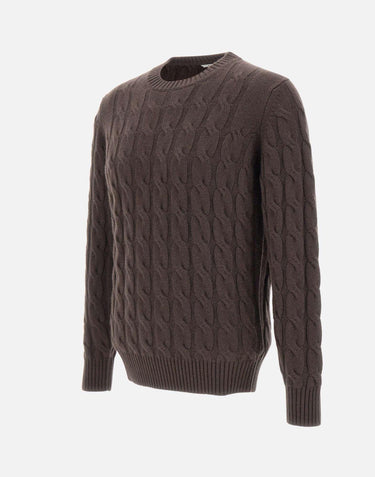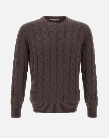 Kangra men's sweater in fine chocolate brown cashmere, featuring a refined maxi cable knit. It features a crew neck, long sleeves, and ribbed edges at the collar, cuffs, and hem for comfort and shape retention. Regular fit. Made in Italy, it's ideal for completing casual or elegant looks with a touch of exclusivity.