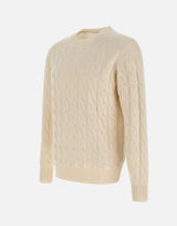 Maglia uomo Kangra in pregiato cashmere color panna, caratterizzata da una raffinata lavorazione a maxi trecce. Modello girocollo con maniche lunghe e bordi a costine su collo, polsini e fondo, che ne assicurano comfort e tenuta della forma. Vestibilità regular. Made in Italy, ideale per completare look casual o eleganti con un tocco di esclusività.