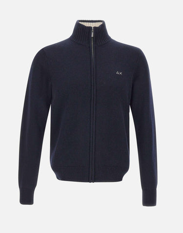 Men's sweater in a premium wool and cashmere blend, navy blue, featuring a high neck, ribbed cuffs, and hem. The full zip front adds practicality and a sporty touch to this warm and elegant piece, ideal for the cold season.