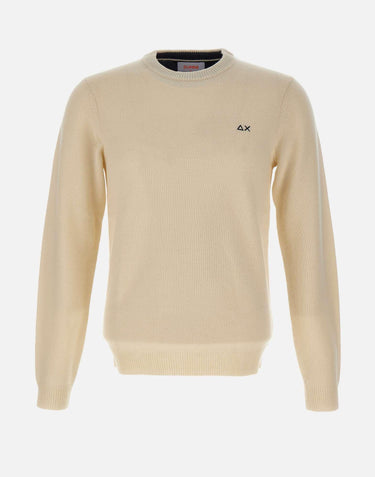 Sun68 men's wool and cashmere sweater, cream, long sleeves, crew neck with contrasting interior, embroidered logo on chest, ribbed cuffs, regular fit