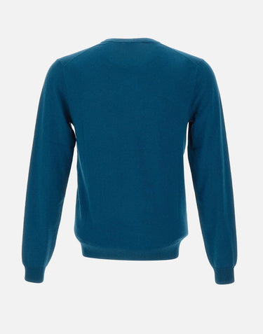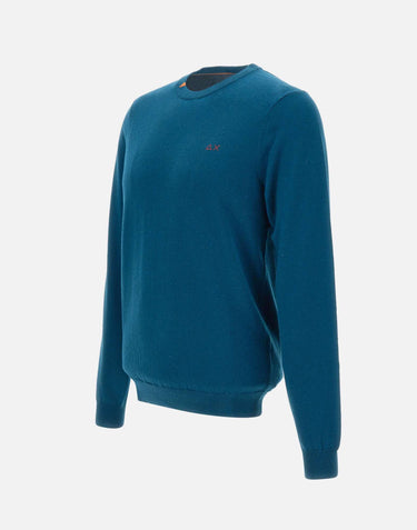Sun68 men's wool and cotton sweater, teal blue, Everyday collection, long sleeves, crew neck with contrasting color details, logo on chest, ribbed cuffs, regular fit