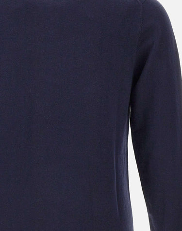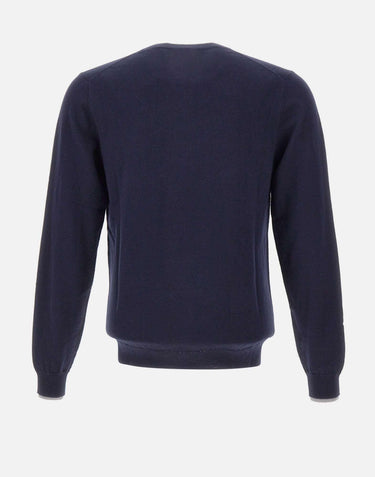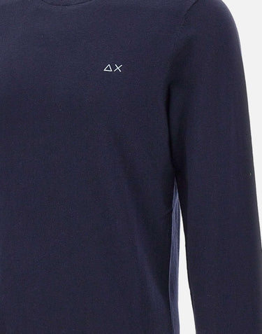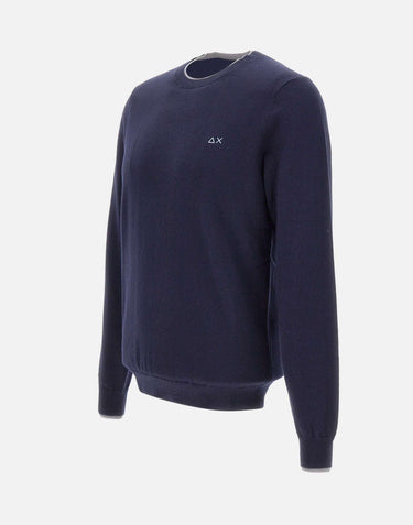 Sun68 men's wool and cotton sweater, navy blue, long sleeves, crew neck, contrasting double-fabric trim, logo on chest, ribbed cuffs, regular fit