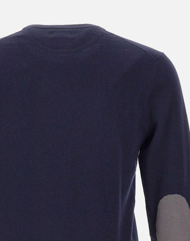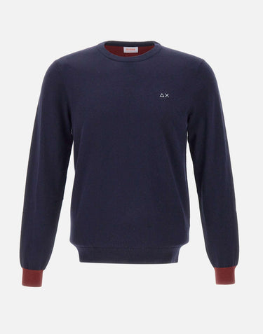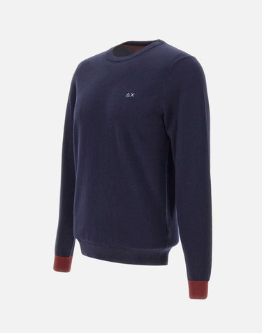 Sun68 men's wool and cotton sweater, navy blue, long sleeves, crew neck, contrasting elbow patches and cuffs, logo on chest, ribbed cuffs, regular fit