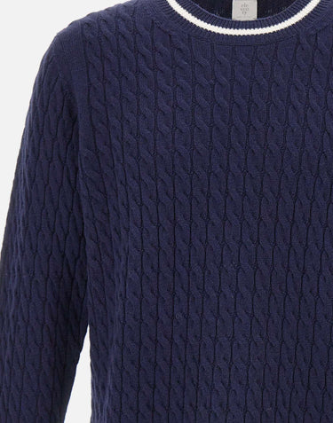 Eleventy men's wool blue Platinum line cable-knit weave sweater, ribbed edges and contrasting color, long sleeves, crew neck, regular fit, made in Italy