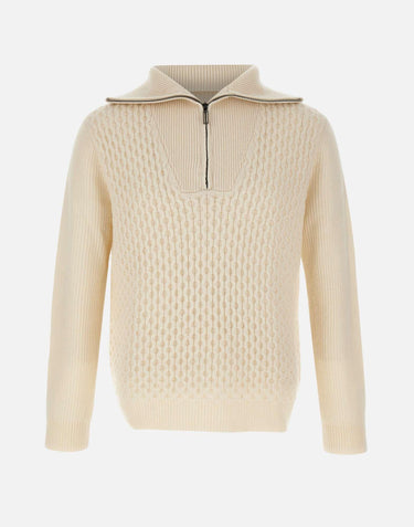 Paolo Pecora men's wool sweater, cream, wide high neck with half zip closure, honeycomb texture, ribbed edges, long sleeves, regular fit