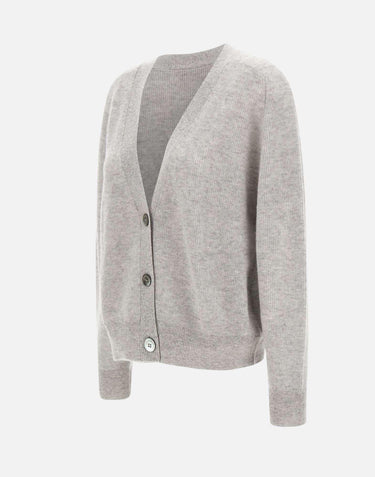 This elegant and enveloping women's Hemisphere cardigan in pure grey cashmere features a V-neck, a front closure with large mother-of-pearl buttons, long sleeves, and raglan shoulders for a comfortable fit. Ribbed edges complete the design, adding structure and a touch of sophistication. The relaxed fit is ideal for casual-chic looks and seasonal layering.