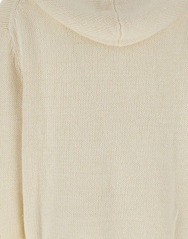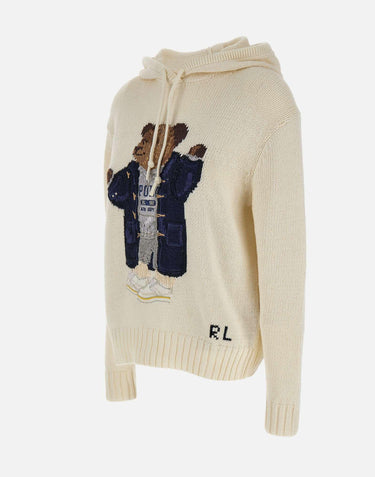 Women's Polo Ralph Lauren "Classics" sweater in a milky white cotton and linen blend, featuring a casual and comfortable design. It features long sleeves with raglan shoulders, an adjustable drawstring hood, and ribbed edges. The large multicolored embroidery of the famous Polo Bear on the front adds an iconic and distinctive touch. Relaxed fit for a contemporary and versatile style.