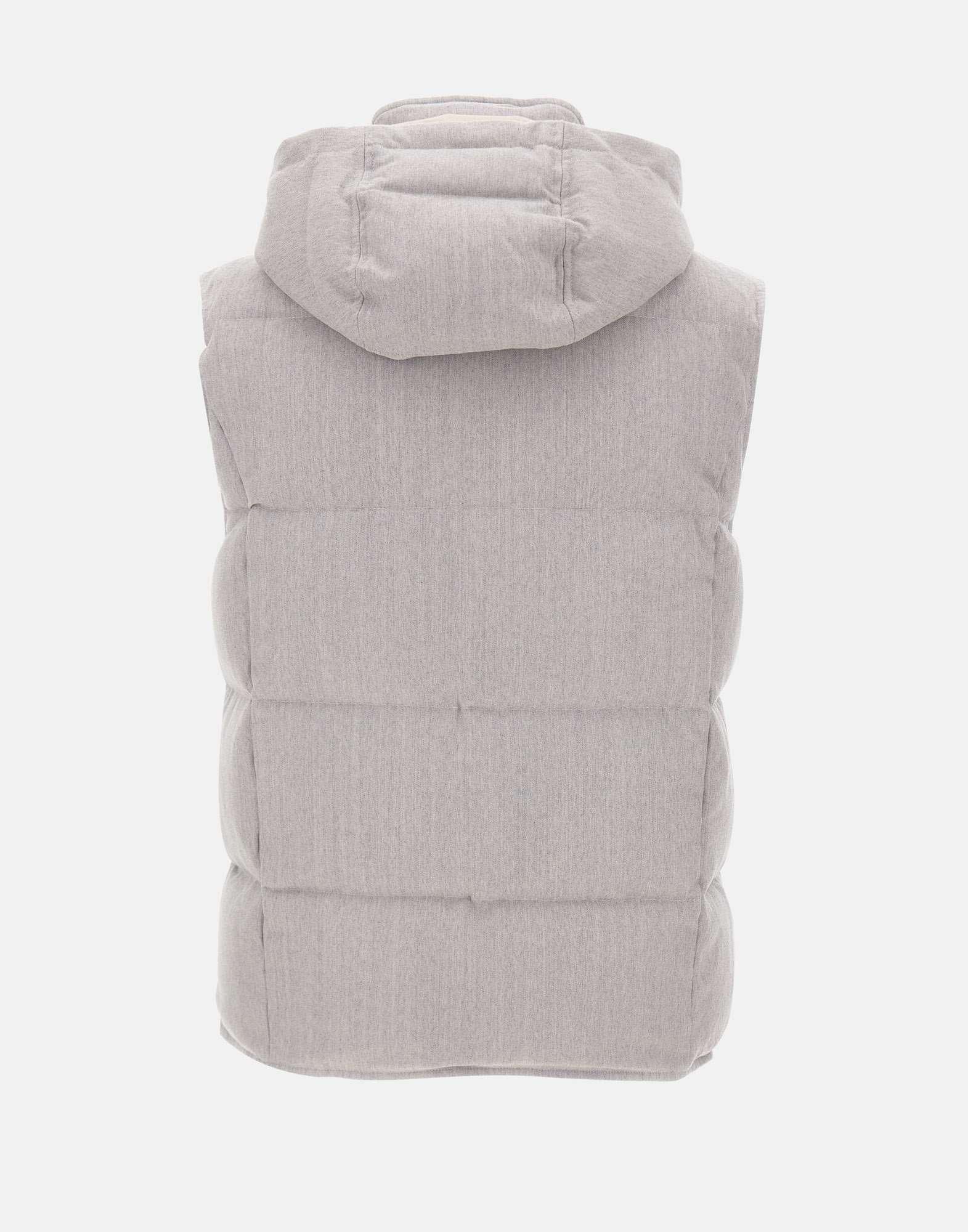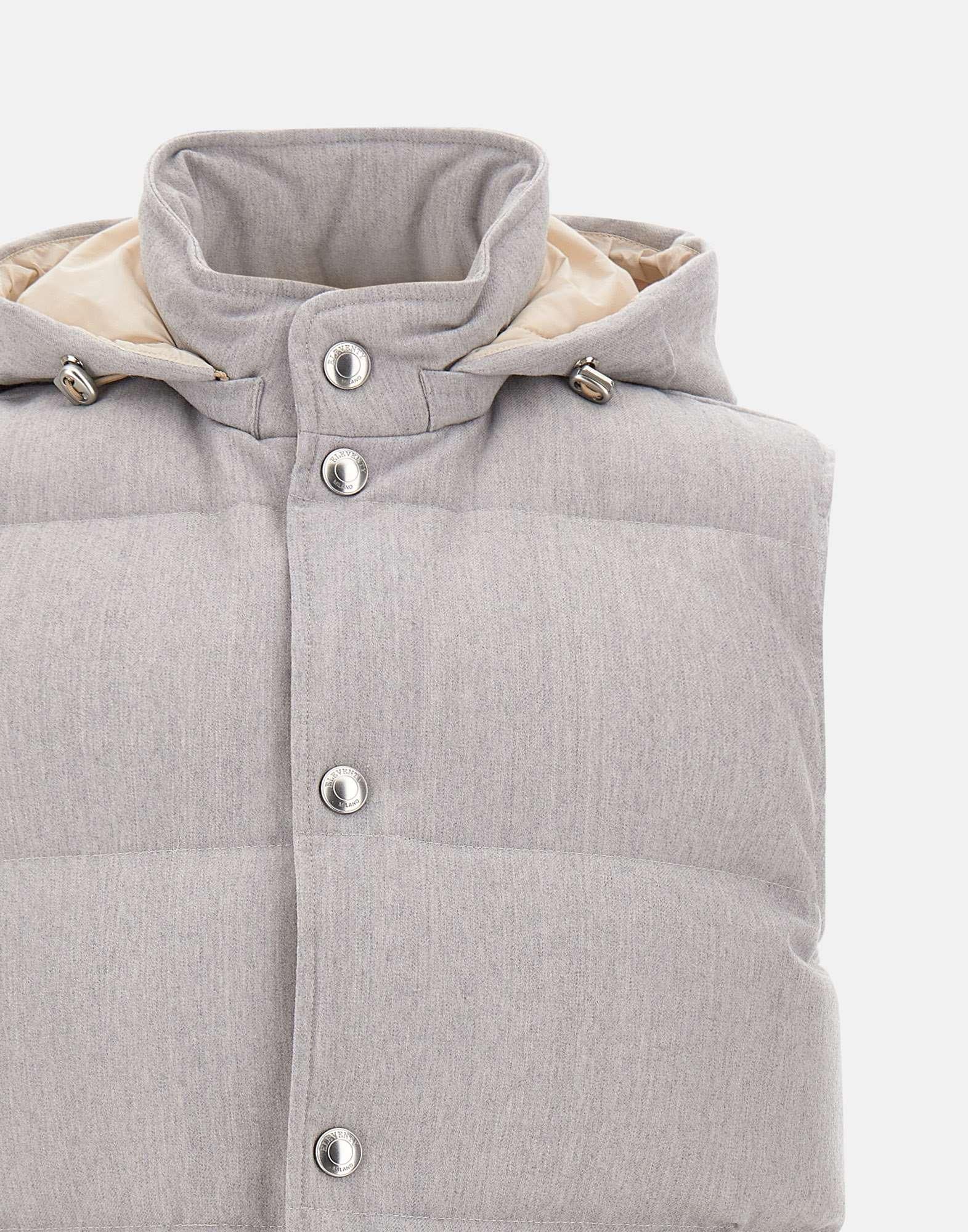 Eleventy men's grey certified eco-sustainable wool fabric vest, Platinum, removable hood with drawstring, down padding, closure with silver logo buttons, side pockets with button, lined, internal pockets, regular fit, made in Italy