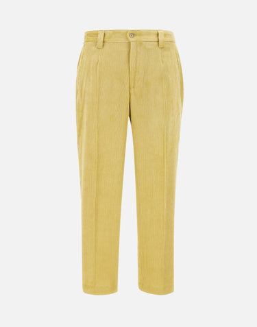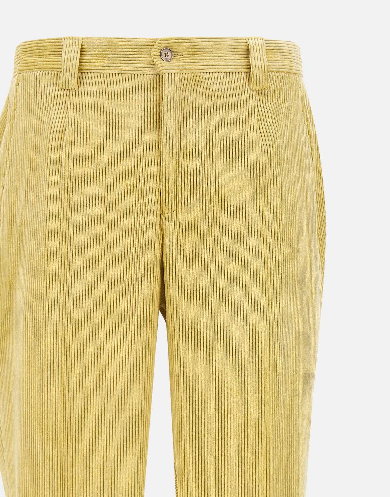 Briglia 1949 "Portofinos" men's trousers in yellow velvet, a piece that blends retro style with contemporary tailoring. Crafted with a soft, velvety texture, they feature a classic fit enhanced by thoughtful details. Featuring two side slit pockets and two rear welt pockets, they are finished with a zip and button closure and belt loops for a versatile and structured fit.