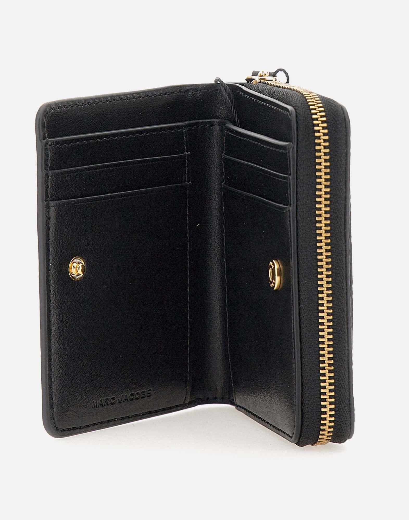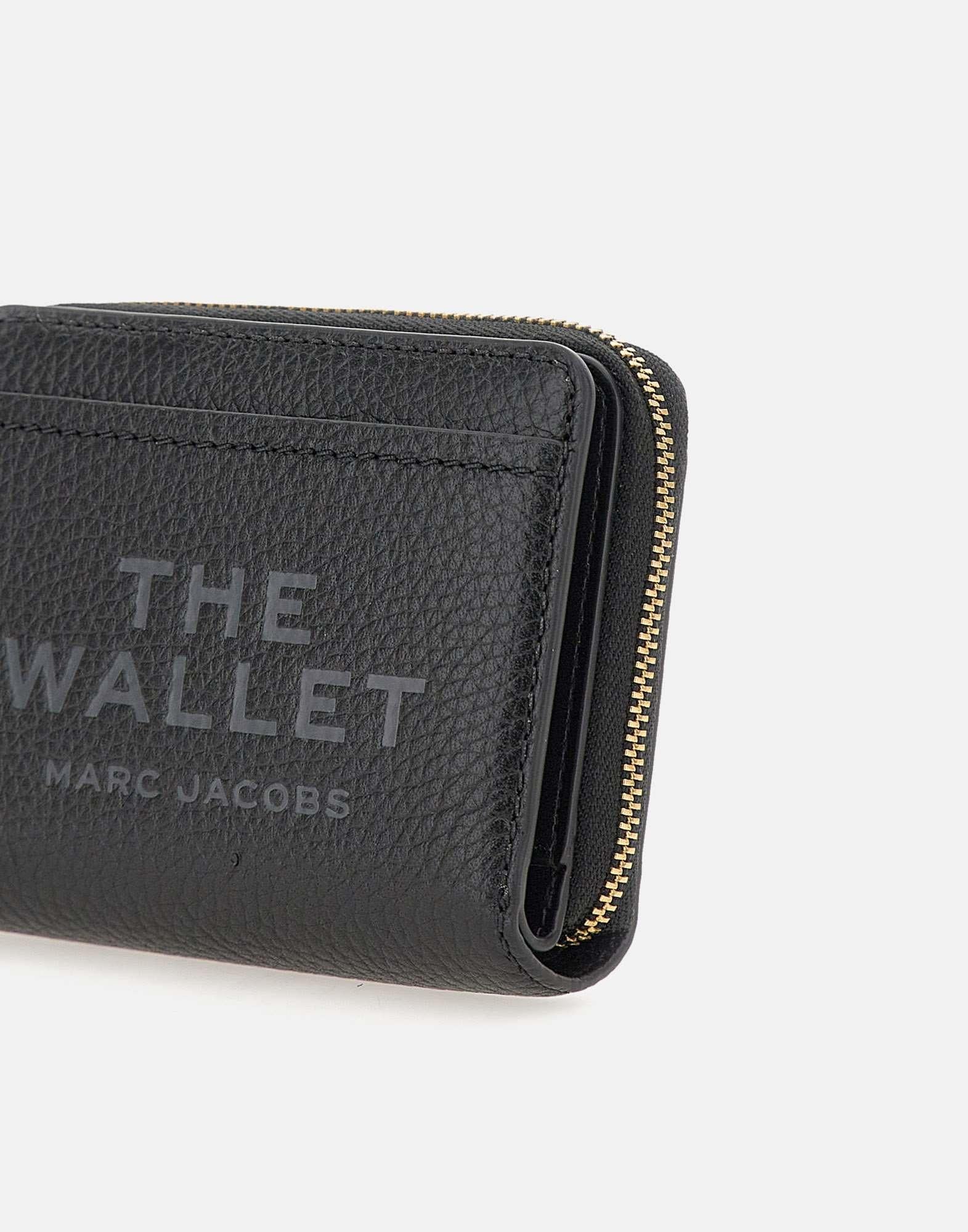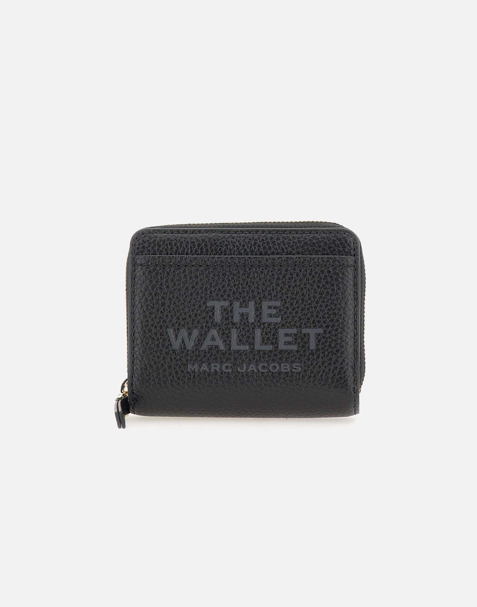 Marc Jacobs "The Wallet" grained leather wallet, black colour, coin pocket with zip, button closure, note pocket, card slots, front logo, back logo patch, gold metal hardware. Measurements: 9cm high, 11cm long, 2cm deep.